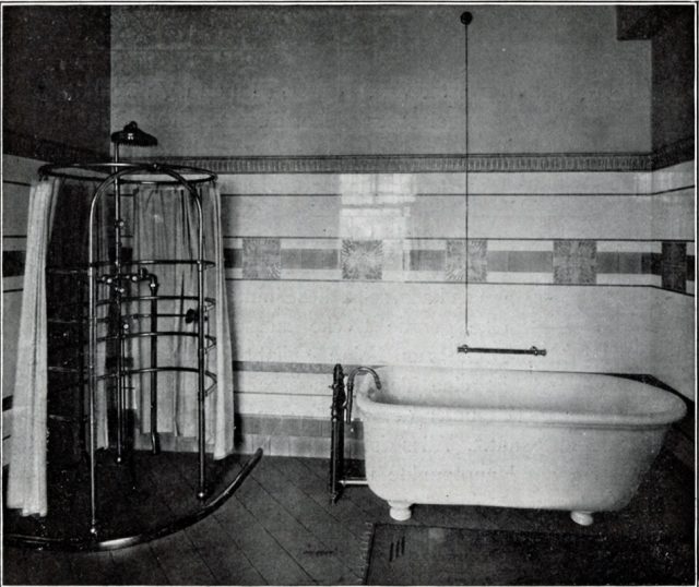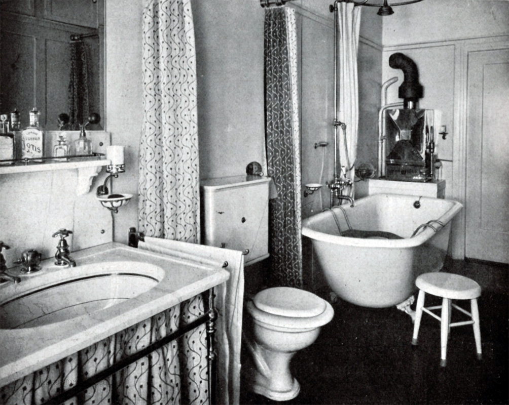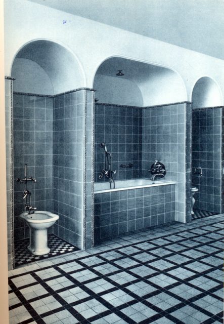 „Badezimmer und Klosett finden sich in neueren Häusern großer Städte oft vereinigt, eine Anordnung, die nur dann angenehm ist, wenn der letztere Platz noch- oder mehrmals vorhanden ist. Die Wände sind mit abwaschbaren Fliesen bekleidet, außer der Badewanne und dem Klosettsitz befindet sich eine Waschtoilette in dem Raum, alles mit wohlgeregeltem Warm- und Kaltwasserzu- und -abfluß versehen.“
