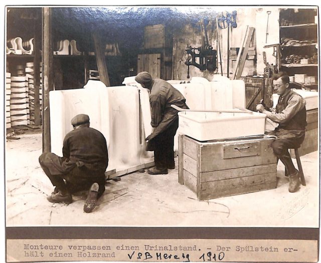 Schon damals stattete Villeroy & Boch auch öffentliche Gebäude, Hotels und Restaurants aus – z.B. mit Urinalen, die in öffentlichen Toiletten immer öfter eingebaut wurden, da platzsparender, hygienischer und auch wassersparender. Erstaunlich, aber schon damals ein Thema. Um ehrlich zu sein, nicht vorwiegend aus umwelttechnischen Gründen, sondern weil die städtischen Wasserversorgungen den steigenden Bedarf teilweise nicht mehr decken konnten.