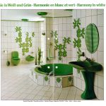 Jeweils typische Farben und Muster der jeweiligen Jahrzehnte werden für die Badgestaltung umgesetzt, ob nun „sixties“ oder „seventies“. An den Bildern ist auch gut zu sehen, wie Bäder als Zimmer wichtiger werden. Sie werden größer und geräumiger und zum „Wellness-Bereich“ – ein Trend, der bis heute anhält.