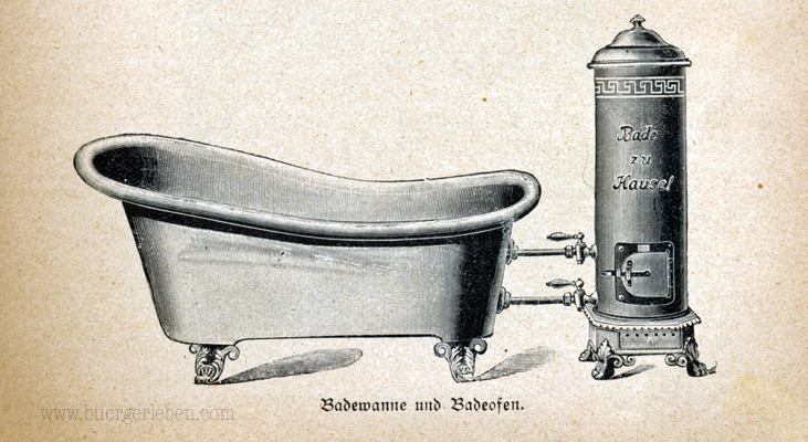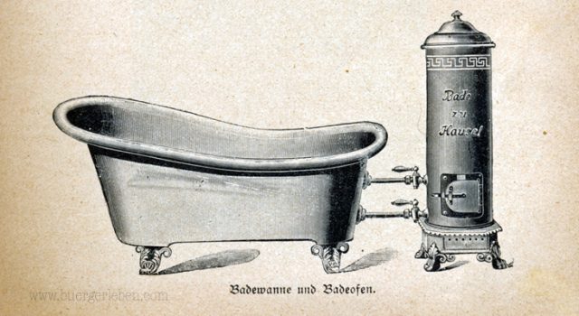 In der 2. Hälfte des 19. Jahrhunderts gab es immer mehr Klosetts mit Wasserspülung, welche die bis dato vorherrschenden „Plumpsklos“ ablösten. Wobei sich diese bis weit ins 20. Jahrhundert noch hielten – das weiß ich aus eigener Erfahrung! Denn in meiner ersten (psst besetzten!) kleinen Wohnung in Jena befand sich noch so ein Relikt dieser Art auf halber Etage – jeweils für zwei Mietparteien. Wahrscheinlich auch ein Grund, warum die Wohnung (bei Wohnungsnot) länger leer gestanden hatte. Diese einfachen Arbeiterwohnungen eines Anfang 1900 gebauten Mietshauses hatten auch allesamt kein Bad. Fließendes (kaltes) Wasser gab es in der Küche, eins von zwei Zimmern war mit Kohleofen heizbar. Das Schlafzimmer wurde nicht geheizt – zum Glück bekam ich von meiner Oma vom Land ein dickes Federbett. Tja, insbesondere in der DDR konnte man den einfacheren Wohnstandard vom Anfang des 20. Jahrhunderts noch selbst erleben…