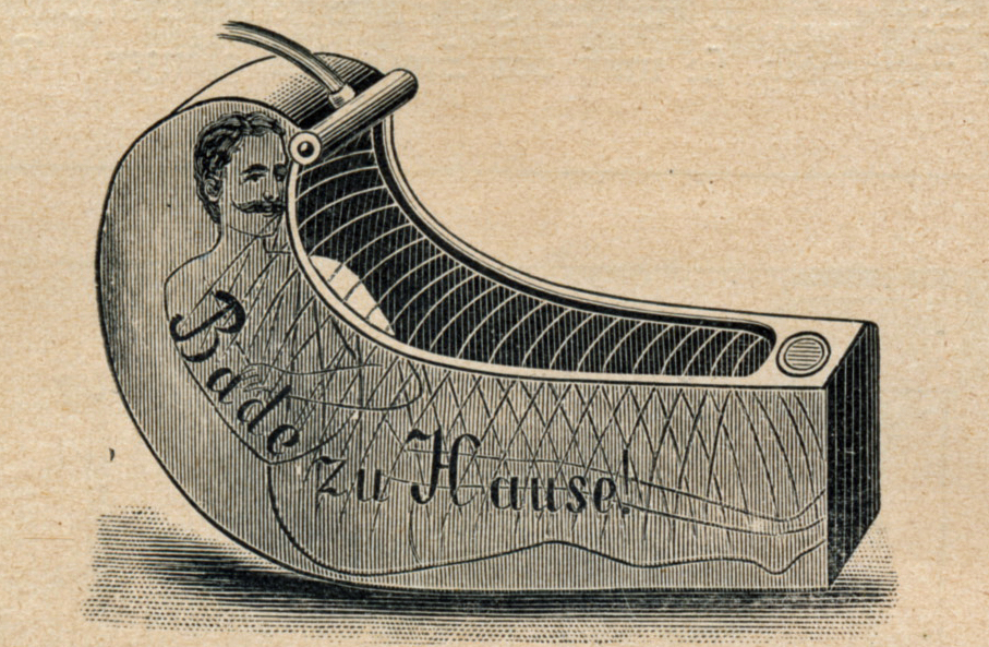 Als Ersatz der großen Badewanne kann, wo ein Extrabadezimmer fehlt, und die Wanne ein Wandermöbel vorstellt, welches ungebraucht im Schrankzimmer, oder etwa gar im Schlafzimmer steht, die Wellenbadschaukel und der Badestuhl empfohlen werden,“ – hier zeitgenössische Werbungen dazu.