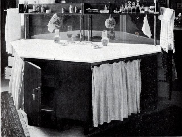 Mit dem Begriff „Toilette“ muss man allerdings vorsichtig sein, wenn man über die Zeit Anfang des letzten Jahrhunderts spricht. Denn mit „Toilette“ wurde die Garderobe (oder das „Outfit“) der Frau bezeichnet. „Toilette machen“ war gleichzeitig ein Synonym für „sich zurecht zu machen“: Am Toilettentisch (der sich meist im Schlafzimmer befand) saß die Dame und pflegte sich: sie benutzte ihre Schönheitsmittelchen für die Hautpflege, frisierte sich und stäubte sich am Schluß noch mit etwas Maiglöckchen-Parfüm ein…Das Wort „Morgentoilette“ wird heute noch ab und zu verwendet.