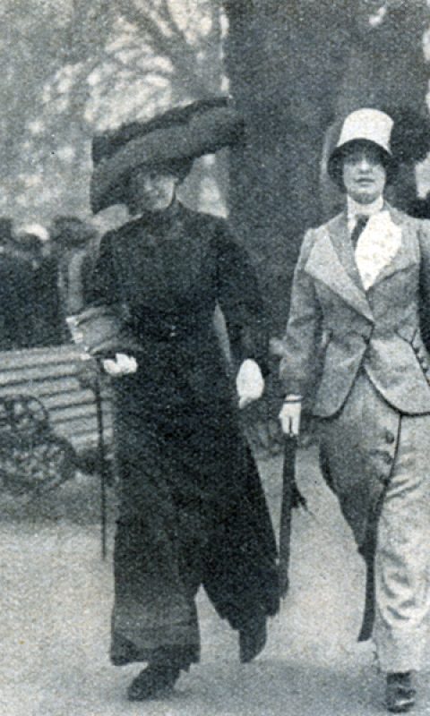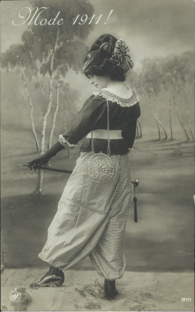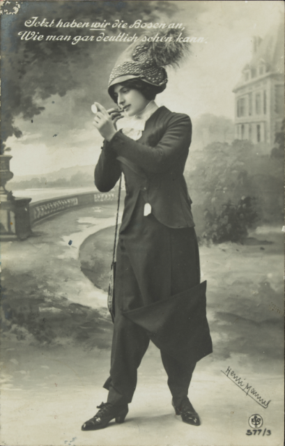 Zu den modischen Neuerscheinungen der Zeit gehört die lange Hose, von deren Existenz deutsche Bildpostkarten nicht ohne Aufregung berichten. Sie initiiert eine Diskussion über Beinkleider »zu einer Zeit, als vornehme Damen offiziell weder Beine noch ein Geschlecht hatten«.[1] Die Vorteile für die Trägerin liegen auf der Hand, sie kann sich frei bewegen, längere Strecken zurücklegen und sich von ihrem häuslichen Umfeld nach Belieben entfernen. Damit steht bei der Herrenhose mehr zur Diskussion als eine neue Mode. Wenn Frauen daran Gefallen finden, so fürchtet man, beginnt allmählich ihr Einzug in die Männerwelt.