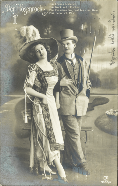 Die eher tragbare Variante, eine Kombination aus langer Hose und rockartigem Überwurf, erobert als Demonstration freizügiger Lebensart auch das Unterhaltungstheater. Auf einer 1912 gelaufenen Karte mit dem Titel »Der Hosenrock« (Abb. 3) stellt sich ein kostümiertes Paar im Tanzschritt vor. Sie trägt – kaum erkennbar unter dem weiten, mit einer Bordüre verzierten Rockteil – ein oberhalb der Knöchel endendes Beinkleid.