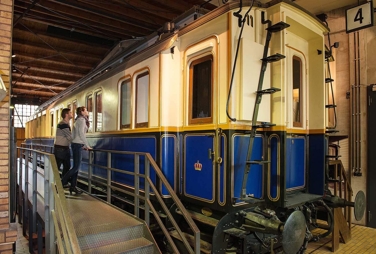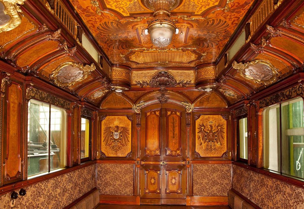 Auch die Geschichte des Waggons selbst ist spannend – nachdem er von 1914 bis 43 schon einmal im alten Berliner Technik-Museum stand, wurde er nach Kriegsende ab 1945 zunächst von einem sowjetischen Marschall in Beschlag genommen. 1954 wurde der Waggon in Gotha entdeckt – dort sollte er als Propagandawagen der sozialistischen Jugendorganisation FDJ hergerichtet werden. Zum Glück kam es dazu nicht und das Verkehrsmuseum Dresden bekam den Wagen zugewiesen. In den folgenden Jahren wurde er in verschiedenen Lokschuppen abgestellt – sein Zustand verschlechterte sich, da die teilweise recht maroden Lokschuppen sicherlich nicht gerade ideale Bedingungen für dessen Aufbewahrung boten. Aber er wurde aufbewahrt (und nicht verschrottet)! Aus der schon in der DDR Ende der 80er Jahre geplanten Restaurierung wurde nichts – so kam der Wagen 1990 nach Potsdam und nach erfolgter äußerlicher Restaurierung ist er nun wieder in Berlin zu besichtigen – das Innenleben wird nach und nach vom Museum saniert, sah aber bei meinem Besuch ganz ordentlich aus (Polstersitze vorhanden!). Wen noch mehr Details der Geschichte des kaiserlichen Salons interessieren, hier sind sie nachzulesen.