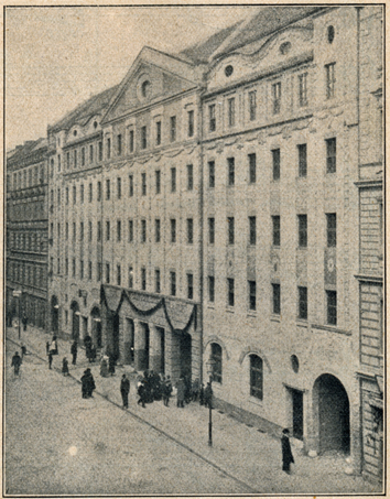 „…Das Haus enthält 300 Betten, zum größten Teil in Einzelzimmern. Die Zimmer haben elektrisches Licht und Zentralheizung (was zu dieser Zeit keineswegs selbstverständlich war), und enthalten für jeden Bewohner einen Schrank, einen Tisch und zwei Stühle. Der Mietpreis beträgt, einschließlich Heizung, Beleuchtung und Frühstück, je nach Lage des Zimmers 10 bis 15 Mark, während derartige Zimmer sonst doppelt soviel kosten. Außerdem besitzt das Heim einen geräumigen Lesesaal mit einer zweckmäßig ausgewählten Bibliothek. Auch eine Speisewirtschaft ist in dem Bau untergebracht, in der zu mäßigen Preisen ohne Trinkzwang Speisen verabreicht werden. Auf dem Dach des Gebäudes ist ein Garten angelegt…“