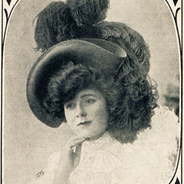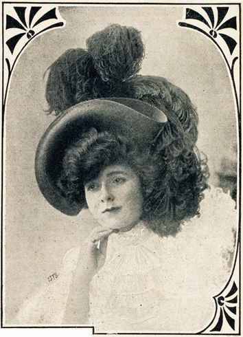 Mittlerer Hut (unten): Dunkelbrauner Taft formte den großen, kleidsamen Hut, der am inneren Rand mit einem breiten, spitzenbesetzten Tüllplissee garniert war. Der volle Rosettenknoten, dr den Hut vorn garniert, ist aus braunem Taft gefertigt. Schwarze und weiße Reiherfedern ergeben die weitere Garnitur des Hutes.