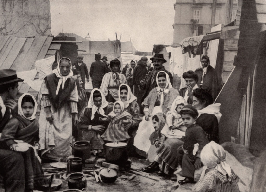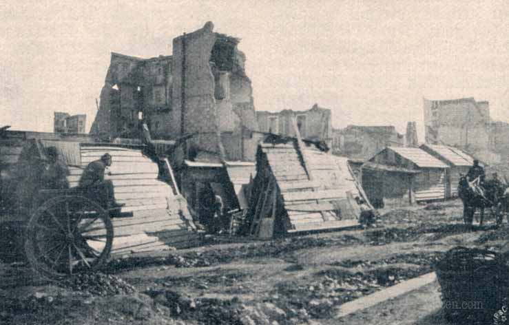 Auch die italienische Regierung hat allenthalben, besonders bei deutschen Firmen, Baracken nach verschiedenen Systemen bezogen, die eben aufgestellt werden. Die deutschen Arbeiter, die mit dem Material hierhergesandt wurden, leben ganz so wie die Obdachlosen, schlafen unter Brettern, die sie sich zu Flugdächern zusammenstellen, und kochen ihre Mahlzeiten im Freien.
