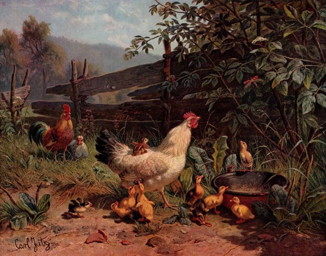 Am Schluß wird es österlich – ja, der Osterhase ist nicht auf dem schönen alten bunten Bild, aber dafür die Eierlieferanten. Ich wünsche Euch einen lustigen April – laßt Euch ruhig mal veräppeln am 1. – auch in dieser Ausgabe hat sich übrigens ein kleiner Scherz versteckt (der in der Mai-Ausgabe aufgelöst wird)! Und ansonsten probiert doch mal ein paar neue Fortbewegungsarten auf Euren Wegen aus, ob nun zur Arbeit oder in den Garten –sie müssen ja nicht gleich so akrobatisch wie die von Max Duffek sein.