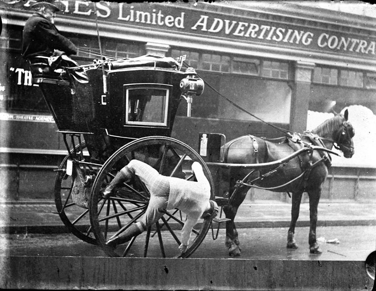 Auf dem Schloßplatz angekommen, schnallte er sich flugs Rollschuhe unter – ausnahmsweise nicht unter die Hände – fuhr schnellen Tempos die Linden entlang, warf sich dann auf ein zufällig dahstehendes Fahrrad (der Besitzer wird begeistert gewesen sein…), benutzte ein Auto, einen Omnibus, schwang sich auf den Gaul eines Lastwagens und erfreute dann eine militärische „Ablösung“ durch einen Parademarsch im Handstand. Unsre Bilder zeigen den Fortgang dieser mehr als seltsamen Art zu reisen, die so bald wohl keine Nachahmung finden dürfte, denn es ist eben nicht jeder ein „Artist“ von solch universeller Beherrschung der Glieder. Duffek, ein geborener Münchener, der jetzt im 32. Jahre steht, hofft auf dieser drei bis vier Jahre berechneten Reise durch artistische Vorführungen auch noch Geld zu verdienen.