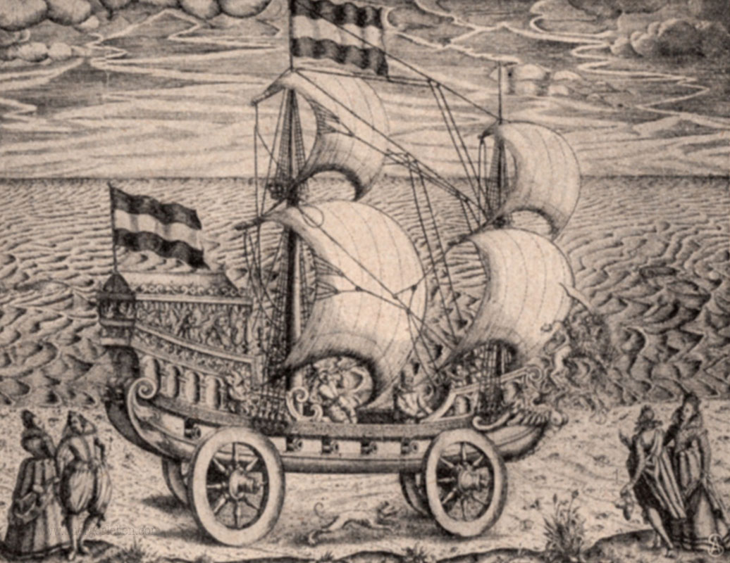 Wenn das Bild nicht wirklich historisch überliefert wäre, würde man es nicht glauben: Tatsächlich erzählt die Gartenlaube in einer Aprilausgabe über „einen fürstlichen Kraftwagen von 1599“. Okay, motorisiert waren die damaligen Kraftwagen noch nicht, sie wurden mit Windenergie betrieben. Das obige Fahrzeug wurde mit seinen Segeln vom niederländischen Mathematiker Simon Stevin erdacht. Zunächst (mal wieder, wie leider einige bahnbrechende Erfindungen) für Kriegszwecke –die Niederlande befanden sich zu dieser Zeit im Krieg.