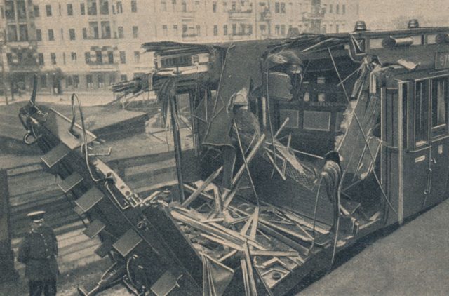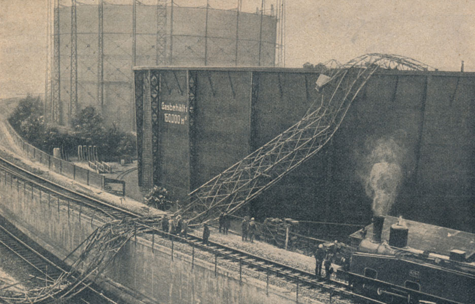 Gerade als an der Schöneberger Gasanstalt bei Berlin ein Zug der Vorortbahn vorüberfuhr, stürzte ein für den Bau eines neuen Gasometers benutzter, 85 Meter hoher, eiserner Kran infolge von Überlastung zusammen. Er schlug über die Bahngeleise und zertrümmerte das Abteil eines Waggons. Drei Personen wurden schwer verletzt. Nur dadurch, daß der Zug sofort zum Stehen kam, wurde unabsehbares Unglück verhütet.