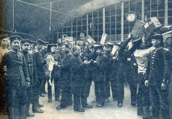 Zu keiner Jahreszeit ist der Dienst im Hauptpostamte Berlins so aufreibend, wie zur Weihnachtszeit, denn jeder will die Gaben seiner Lieben rechtzeitig in den Händen haben. Die Zahl der einlaufenden und abzusendenden Gepäckstücke und Briefe geht in die Millionen, so daß selbst zahlreiche Soldaten hinzugezogen werden müssen, um den Riesenverkehr zu bewältigen.