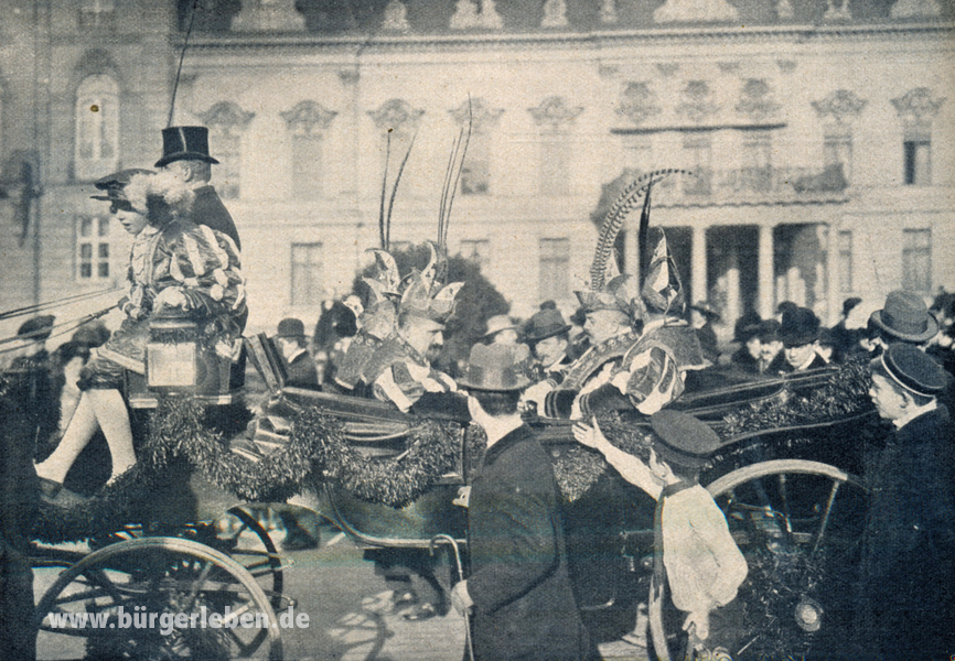 Wir starten mit Karneval! Helau und Alaaf! Schon damals (und schon lange) wurde der Karneval im Rheinland kräftig gefeiert, ob nun in Köln oder Düsseldorf, wie diese Artikel erzählen. Hier ein Bild von einem Karnevalsumzug mit Kölner Jecken.