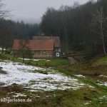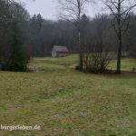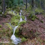 An einem Wintertag im Januar, an dem es erst regnete und dann schneite, machte ich mich auf in das Ellenbachtal, an dessen Ende das Dorf zu finden sein soll. Es wurde ein idyllischer Spaziergang. Durch das Tal führt ein Naturlehrpfad, neben dem Ellenbach sprudelten am Weg allerlei Quellen, wild oder eingefasst. Heute ist das Tal ein Naturschutzgebiet – die Wiesen werden werden vom Forstamt regelmäßig entbuscht, gemäht und bewirtschaftet, um sie offen zu halten und den Charakter dieses Tales zu bewahren – so wird es auf einer Schautafel am Anfang des Weges erzählt. Wie man sieht, ist Dürr-Ellenbach noch bewohnt, wie es aussieht, ist die Anzahl der Bewohner sogar gestiegen! Die Anzahl der vorhandenen Fahrzeuge auf jeden Fall…