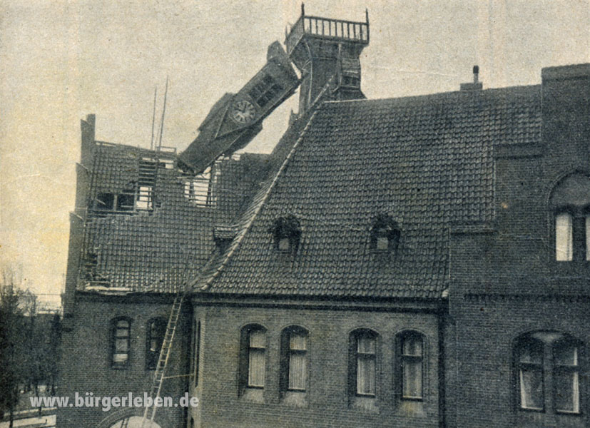 Oups! Schiefe Türme kennen wir ja einige, allen voran den in Pisa. In Nauen gab es kein Halten mehr – der Turm fiel ein, auf das Dach darunter. Und das während einer Magistratssitzung! Nein, nicht weil es in der Sitzung so hoch ging, sondern durch „einen orkanartigen Sturm, vom dem das Osthavelland heimgesucht wurde“. Keine Angst, die Sitzungsteilnehmer kamen nicht zu Schaden und dass, obwohl die Turmspitze in das Sitzungssaal ragte! Auch keine weiteren Personen kamen zu Schaden.