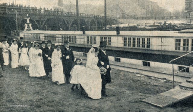 Heute kann man in allen möglichen Lokalitäten heiraten, in der Kaiserzeit war es eher klassisch das Standesamt, die Kirche oder beides. Auf einem Schiff zu heiraten, war schon sehr bemerkenswert. Die Schifferkirche gab es seit 1904 – zur Einweihung schaute sogar die Kaiserin vorbei. Sie war für die Binnenschiffer gedacht, die auf den Flüssen und Kanälen unterwegs waren. In der Schifferkirche fanden Gottesdienste, Taufen, Konfirmationen und eben auch Hochzeiten statt, gehalten vom 1902 eingestellten Schifferpfarrer. Sie hatte verschiedene Liegeplätze und war nicht nur in Berlin, wie auf dem Bild, sondern auch in Brandenburg unterwegs.