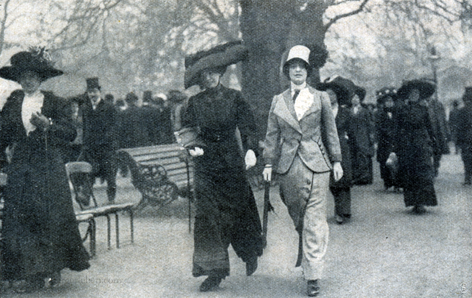 „Der Hosenrock, die etwas seltsam neue Schöpfung der alleinseligmachenden Pariser Mode, gewinnt ohne Zweifel ständig an Boden. Bei der Eröffnung des Hippodroms in Auteuil konnte man schon eine größere Anzahl von Damen mit geteilten Röcken sehen“.