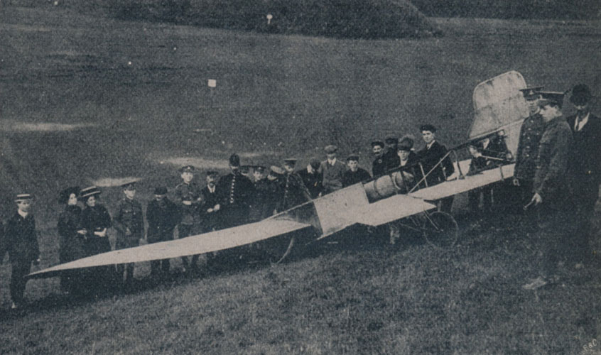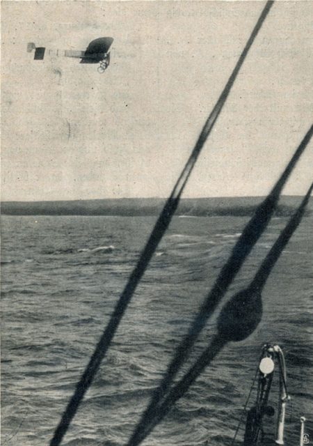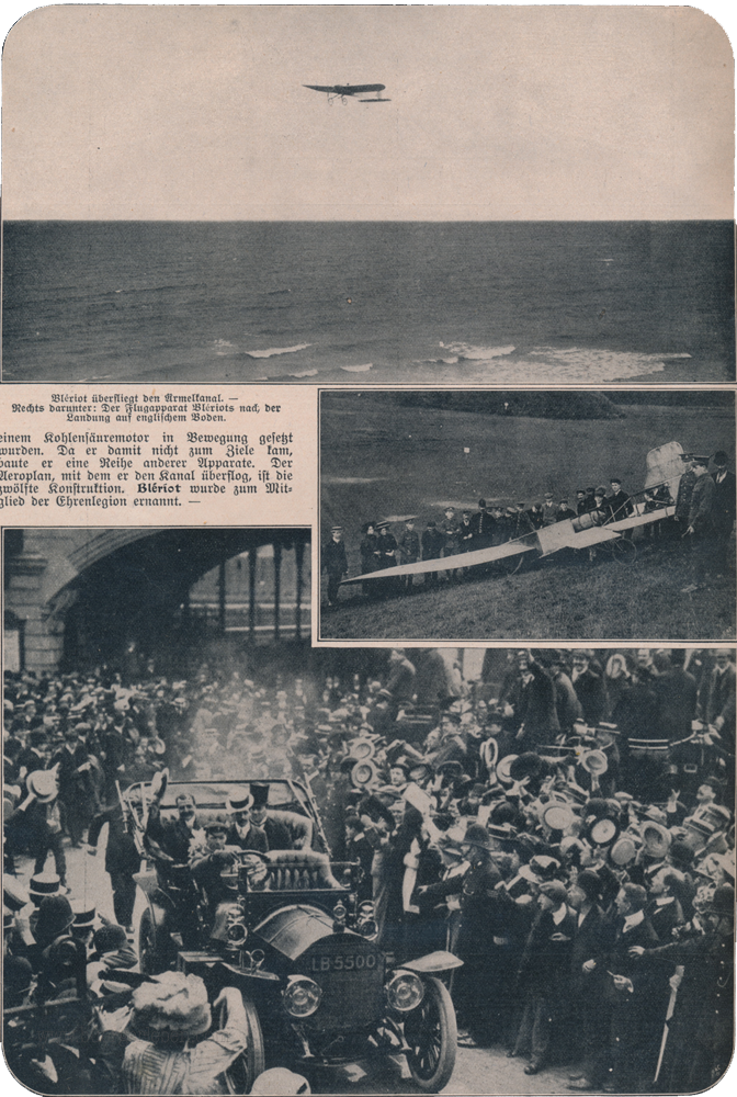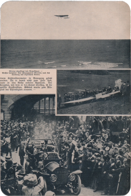 …Trotzdem eine nicht unerhebliche Verletzung am Fuß, die er sich bei seinen Flugversuchen zugezogen hatte, noch nicht behoben war, unternahm er es in der Morgenstunde des 25. Juli, die Ueberquerung des Kanals mit seiner Maschine durchzuführen. In der kurzen Frist von 27 Minuten gelang es ihm, die englische Küste zu erreichen und unter brausendem Jubel der herbeigeströmten Menge hinter den Klippen von Dover zu landen…