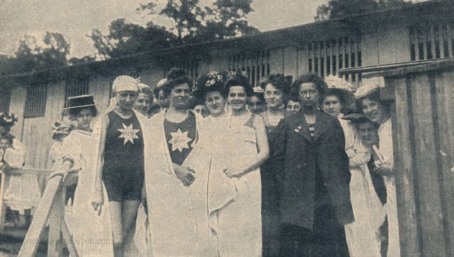 So der Untertext zu diesem entzückenden Bild – oder? Durften die Damen nicht mitspringen oder wollten sie nicht? Und warum gibt es kein Bild vom Gewinner (dem bekannten Meister Hooff) vom Poseidon-Verein? Der übrigens mit Vornamen Otto hieß und bis 1907 immerhin mehrmaliger deutscher und Europa-Meister im Wasserspringen war. Vermutlich waren die Charlottenburger Nixen einfach fotogener!