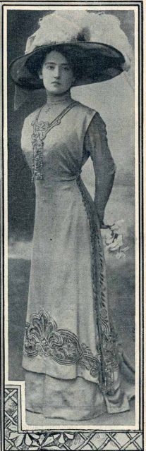 Das Frühjahrskleid sollte also bloß nicht zu jugendlich farbig, sondern gedeckt sein. Bei den Fotos fällt auf, es wird Tunika getragen! Dieses Kleidungsstück gab es also schon damals, nur länger…