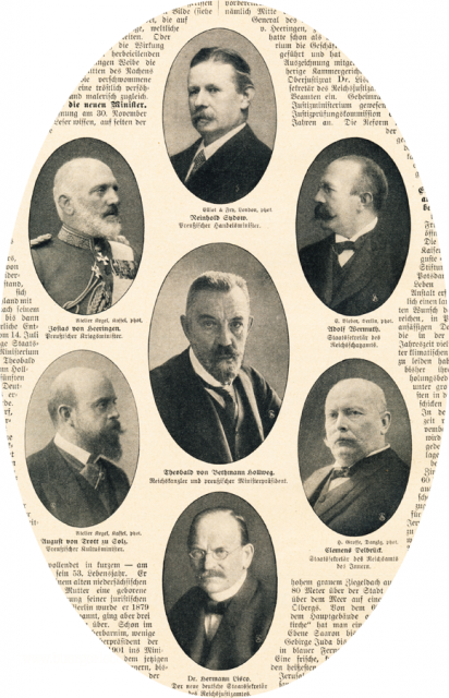 Bei den Untertiteln sehen wir unterschiedliche Bezeichnungen und teilweise mehrere – so beim Reichskanzler Bethmann-Hollweg, der gleichzeitig preußischer Ministerpräsident war. Die übergeordnete Reichsleitung (vergleichbar mit der heutigen Bundesregierung, aber mit weniger Kompetenzen) konnte in den Bundesrat (als höchstes Verfassungsorgan im Kaiserreich) keine Gesetzesentwürfe einbringen – das konnte nur über die Länder geschehen. Da Bethmann-Hollweg aber gleichzeitig preußischer Ministerpräsident war, konnte die Reichsleitung ihre Gesetzesinitiativen via den preußischen Ministern in den Bundesrat (und der dann in den Reichstag) einbringen. Bei der Reichsleitung gab es keine Ministerien, sondern stattdessen Reichsämter mit Staatsekretären an der Spitze. Trotz allem waren die Ämter waren aber vergleichbar mit den heutigen Ministerien.