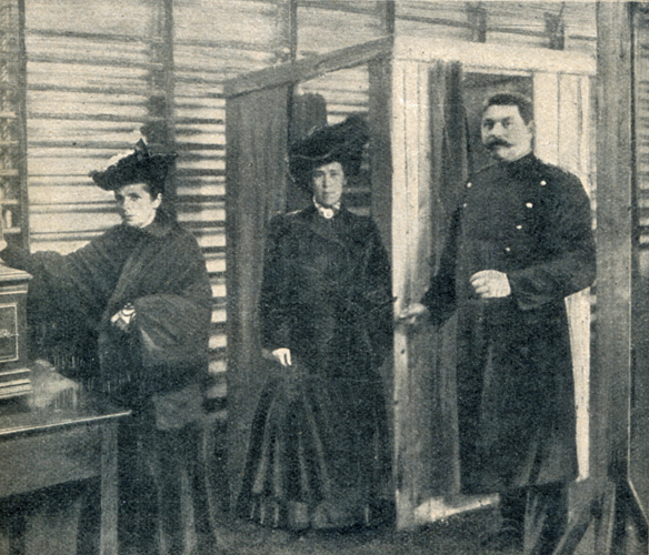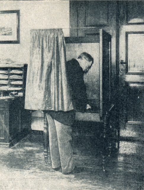 Und weil wir gerade bei den Wahlen sind, ist hier noch ein Bild einer Wahlkabine, wie sie zur Wahl von 1907 aussah mit dem Original-Untertext.