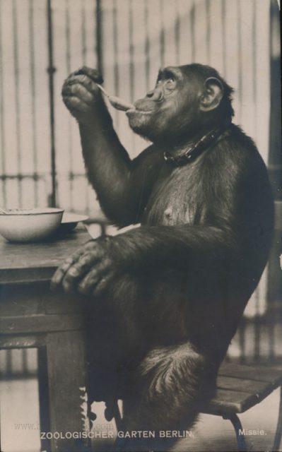 Heute ist das alles eher verpönt, Tiere werden nicht mehr in Kostüme gesteckt und keiner würde Schimpansen Kaffee oder Zigaretten geben – wobei „Missie“ ja anscheinend beides vertrug. „Missie“ war übrigens wirklich eine Berühmtheit und ein Liebling der Besucher des Berliner Zoos, der sogar ein Denkmal gesetzt wurde. Seit 2014 steht es im Treppenhaus der Eingangshalle der alten Nationalgalerie, im 2. Weltkrieg war es zunächst verschollen.
