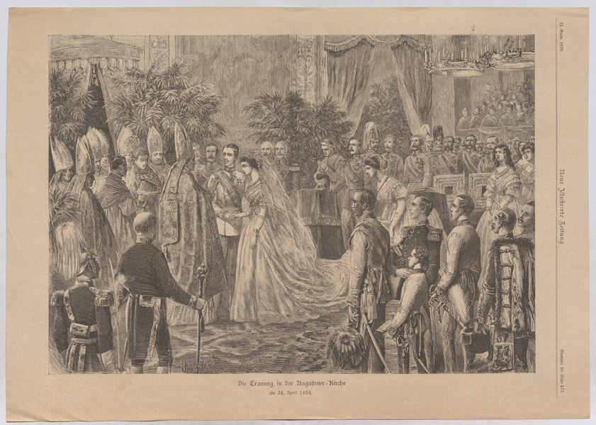 Vinzenz Katzler (Künstler), "Die Trauung in der Augustiner-Kirche am 24. April 1854.", 1879, Wien Museum Inv.-Nr. W 2565, CC0 (https://sammlung.wienmuseum.at/objekt/377882/)